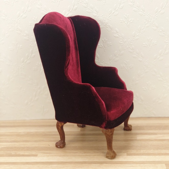 Fotelik w głębokiej czerwieni aksamitnej tkaniny doda wnętrzu charakteru, przytulności i estetyki premium. Idealny dla lalek o wysokości ok. 30 cm (Barbie, kolekcjonerskie 1:6, fashion dolls).