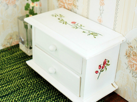 Mebelki ozdobione techniką decoupage motywami róż w odcieniach czerwieni, inspirowane romantycznym, angielskim ogrodem. Malowane pastelową bielą, zabezpieczone lakierem. Idealne do zabawy i jako dekoracja pokoju dziecięcego. Każdy mebelek pakowany w kartonik, z dodatkami (dywaniki, serwetki, poduszki).