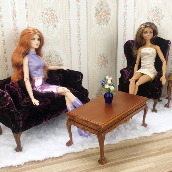Elegancki zestaw miniaturowych mebelków – fotelik i sofa obszyte fioletową, wzorzystą aksamitną tkaniną. Idealne do domku dla lalek, dopasowane do lalek o wzroście około 30 cm, takich jak Barbie.