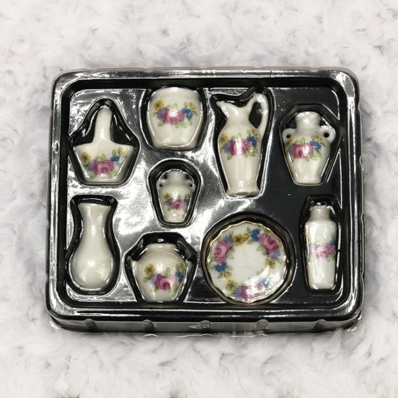 A charming set of miniature dishes, perfect for decorating dollhouses in 1:6 or 1:12 scale. The set includes 7 decorative vases, a ceramic basket, and a plate – all beautifully detailed and adorned with a delicate floral pattern.