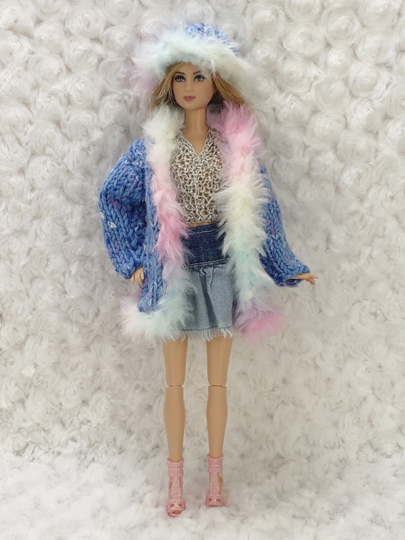 Ręcznie wykonany, 5-elementowy zestaw w kolorach niebiesko-srebrnych dla Barbie: sweterek, spódniczka, czapka, płaszczyk i buciki. Idealny na zimowe stylizacje!