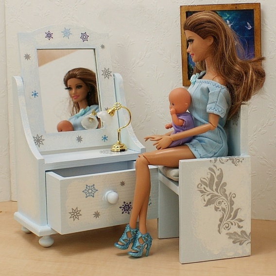 Kolekcja drewnianych mebelków dla lalek w zimowych barwach. Idealne do zabawy i dekoracji pokoju. Pasują do lalek i pluszaków do 31 cm.